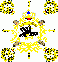 This flag has a ratio of approximately 19:18. It is a dark red flag with a white Greek cross in its centre, in each corner is a white flying cannon ball, the cross is surrounded by a golden rope, which is superimposed by 6 golden bundles of tools, each containing a spade, a hammer, an axe and a mattock. The upper part of the rope is superimposed by a red scroll with motto in golden letters. In the centre of the flag is the Prussian eagle (pattern 1740) superimposing the cross. Sources: [neu39a]; p.37