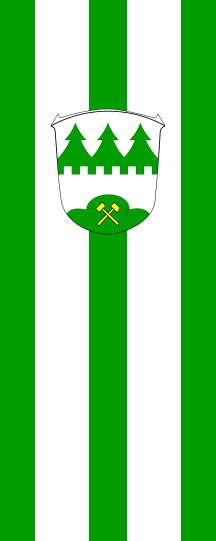 It is a vertical 5-stripes banner with alternating green and white stripes with ratio of stripes approx. 2:3:2:3:2. The coat of arms is shifted to the top within the central stripe.