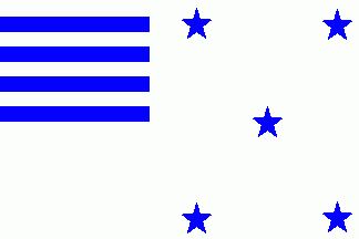 The flag was white. The canton was parted by five blue horizontal stripes. On fly were five blue 5-point stars in quincunx.