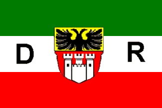 It is a white flag with a fimbriated blue centred cross. The canton is a black over white over black horizontal tricolour. In the lower hoist are three red connected rings, being probably the logo of Krupp steal company.