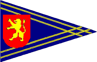 Description of flag: It is a 5-stripes triangular pennant with alternating black and white stripes starting with a black one. It has a white canton (black fimbriated) with black capital letters "RCL".