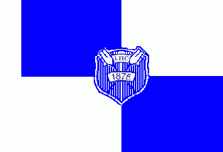 The white flag is divided by a celestial blue saltire.There are black inscriptions in each quarter as follows: "L"(top), "R"(hoist), "V"(fly) and "1878"(bottom). The flag has a white canton separated by thin black lines. Within the canton is a shield with a single rampant lion as supporter.