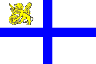 It is a white flag divided by a blue centred cross. In the canton is a yellow lion, holding a globe between its forefeet with two crossed oars on its back.