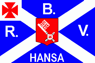 The blue flag was parted by a white saltire with white inscriptions on every quarter as follows: "B"(top), "R"(hoist), "V"(fly) and "HANSA"(bottom).