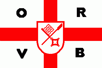The flag was white parted by a red saltire. On centre was a white shield with red edges and charged with a red key of Bremen superimposed by a red oar in bend sinister, black inscriptions "O" (upper hoist), "R" (upper flat), "V" (lower hoist) and "B" (lower fly). It was a predecessor of Bremer RC Hansa and had the same flag with different letters.
