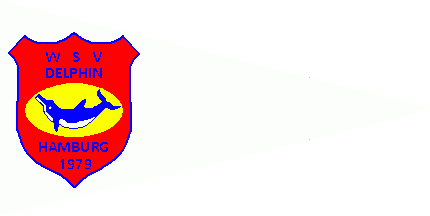 White pennant with logo shifted to the hoist. The logo is a red shield fimbriated blue, in centre a yellow ellipse charged with a blue dolphin, blue inscriptions "WSV DELPHIN" (above) and "HAMBURG 1979" (beneath). The club is based in Hamburg and was established in 1979.