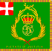 The colours were red parted by a white cross patty, i.e. the canton of the colours of regular units. The cross is called "Maltese cross" by the author.