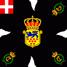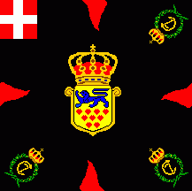 The flag was black with red flames and the arms are based on those of the "King of Goths" in the greater stae arms.