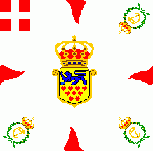 The flag was buff with red flames and the lesser state arms on its centre, shield Or three lions passant Azure in pale, surrounded by nine heartlets Gules.