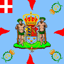 The flag was light blue with red flames and the greater state arms (pattern 1619 – 1816) with the chain of the Order of the Elephant and supported by two savages on its centre.