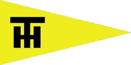 The pennant is The pennant is horizontally divided of white and red. At hoist is a blue sailing ship above and a blue ship propeller below.