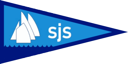 On central hoist are four white sails. On fly is a dark blue inscription "sjs".