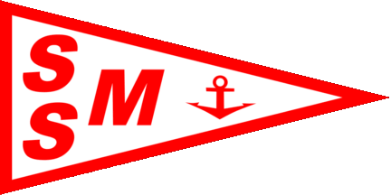 The pennant is white fimbriated red. At hoist is a red inscription in italics "SS" (vertical) and "M".