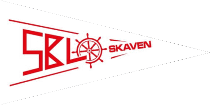 Between two thin red lines parallel to the edges at top and bottom is a red steering wheel flanked by red inscriptions "SBL" (hoist) and "SKAVEN" (fly).