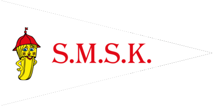 The pennant is white. At hoist is a red ship propeller flanked by red letters "SMK".