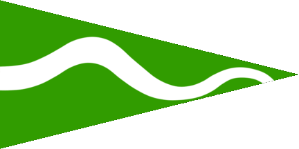 The pennant is white fimbriated blue. On centre is a blue sailing boat flanked by two blue hills.