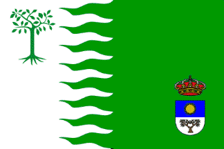 Flag: Panel in proportions 2:3. Tierced at hoist embattled wavy, at hoist white with an almond tree in upper canton, at fly green with the coat of arms in lower canton.