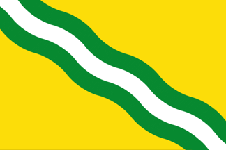 Description: Rectangular flag of yellow color, bearing three waves green, white and green from the top end at the hoist to the bottom at the fly.