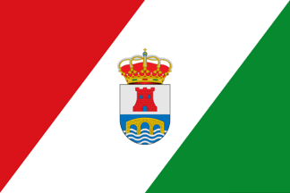 Description: "Rectangular cloth or flag in 2:3 proportions. Divided into three sections. First, crimson red, from the bottom corner of the hoist to the center of the top of the cloth. Second, a white stripe. Third, green, from the top corner of the fly to the center of the bottom of the cloth. In the center, superimposed the municipal coat of arms."