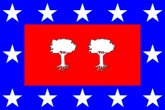 Flag: Rectangular flag, with proportions 2:3, made of a red panel with two white pines eradicated per fess. A bordure of 1/7 the flag's width, blue, charged with 12 white five-pointed stars, five in the upper and lower parts, one at hoist and one at fly.