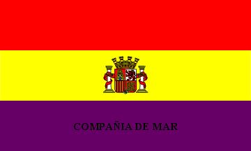 Ensign for ships belonging to the Army which operated in North African waters 1931-1934. Same as the national flag with the caption "COMPAÑIA DE MAR" (sea company) centred on the purple stripe in black lettering. The 1931 Order did not specify the latter colour but a later one did, since it modified the colour from black to white – which stood out better against the wider, purple stripe. Very similar to the previous 1911-1931 flag.
