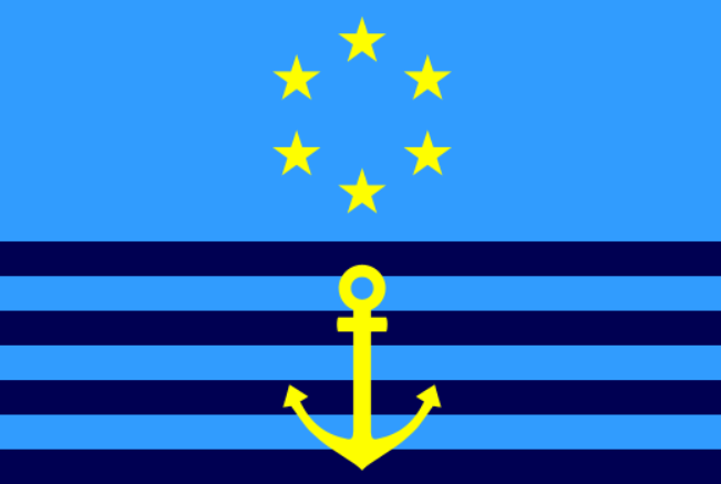 The flag of the Central Commission of the Rhine, as shown in Album des Pavillons [pay00], is light blue with in upper half six five-pointed yellow stars arranged in an hexagonal pattern, and in lower half four dark blue stripes and a yellow anchor over those stripes.
