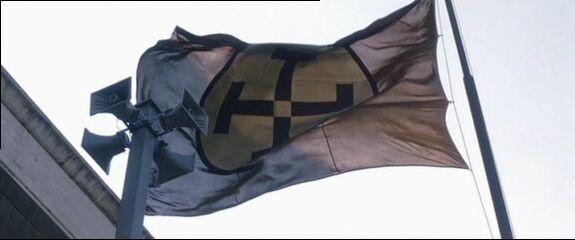 Looking at the flag, it seems to be the usual lazy movie effort where fascist or totalitarian type states are involved. A red background, white centre circle and a black 'swastika' variant cross in the centre.