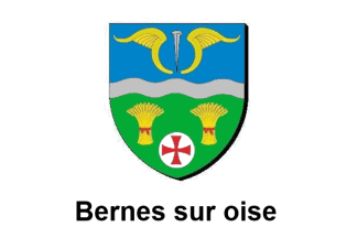 The flag of Bernes-sur-Oise, hoisted in the Champagne-sur-Oise traffic circle with the flags of the other municipalities of the Communauté de communes Haut-Val-d'Oise (photo), is white with the municipal coat of arms, "Per fess wavy argent, 1. Azure two demi-vols or addorsed around a nail argent, 2. Vert, a plate charged with a crosslet patty gules surmounted by two wheat garbs or banded gules.", and the name of the municipality below, as "BERNES-SUR-OISE". The flag hoisted in the same place in 2016 (photo) had the name of the municipality written as "Bernes sur oise" (it should have been "Bernes-sur-Oise").