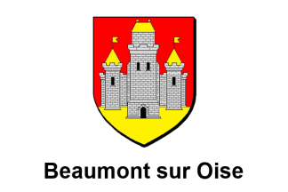 The flag of Beaumont-sur-Oise, hoisted in the Champagne-sur-Oise traffic circle with the flags of the other municipalities of the Communauté de communes Haut-Val-d'Oise (photo), is white with the municipal logo. The flag hoisted in the same place in 2016 (photo) was white with the municipal coat of arms, "Gules a castle argent on a base or port and windows sable with roofs or ensigned by weathervanes of the same", and the name of the municipality below.