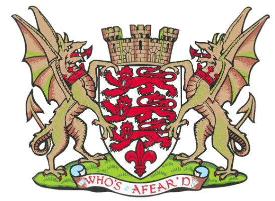 The Dorset Coat of Arms arms were officially granted by the College of Arms in February of 1950. It's design is based on different seals and arms dating back to the original County Council of 1889. It was explained thusly: "The three lions represent England and lions are found in the arms of Dorchester, Bridport, Lyme Regis, Weymouth and Blandford Forum. Lions' faces are in the coat of arms of Shaftesbury. The fleur-de-lis appears in the shields of of Dorchester, Bridport, Wareham and Shaftesbury. The mural crown is designed to echo the insignia of the Dorset Regiment and the Society of Dorset Men and the golden dragon of Wessex or Wyvern represented the ancient kingdom of Wessex."