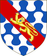 stripe (lower hoist to upper fly) bearing a yellow lion passant guardant, armed and langued azure.