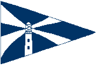The Lossiemouth Cruising Club, Moray, Scotland, web page shows a white lighthouse with four white beams on a dark blue burgee. The beams mimic the Scottish flag.