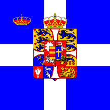The last King of Greece, Constantine II, has lived abroad since 1967. His personal standard is like the [pre-1978, white-cross-on-blue] national flag, but with a large shield of the royal arms in the centre, ensigned with the Greek crown, and a small crown in each canton. The shield of arms is the same as previously used in Denmark: King Constantine is the great-grandson of Prince George of Denmark who became King of Greece in 1863.
