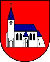 The coat of arms is in a red shield on a green mount a white church with two blue roofed bell-towers between ruined yellow embattled walls and in base a blue wavy line.