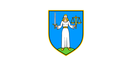The coat of arms is "Azure Justitia clad and blindfoled argent holding in the dexter arm an upright sword proper and in the sinister golden scales standing on a green mount".
