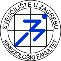 The Faculty uses a circular emblem showing over an inscribed quartered square a blue stylized figure of a sportsman in movement. The central part of the figure is also a stylized Glagolitic letter "K" (Kako) for "kinesiology". In the circumference above is inscribed the University name, below, the Faculty name.