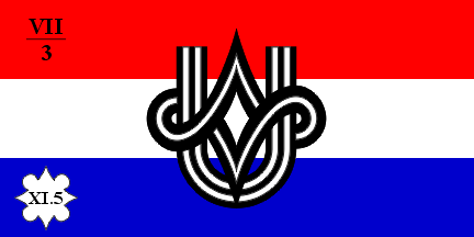 The flag of a platoon of Ustaška uzdanica is a red triangular pennant with a white and black UM symbol near the hoist on the obverse, and with a white, lined in black, symbol of the platoon on the reverse, where there are also headquarter, tabor and platoon numbers inscribed in the fly end. The platoon symbol is different for each platoon, and might have been "a coat of arms of the city or town of platoon's origin, the name of a UM official from that town who was killed in action and considerd a UM martyr, with the date of his martyrdom, or an image of a characteristic plant or animal (e.g. cloverleaf, daisy, dear, wolf, fox, boar, hawk, eagle, rooster, swan etc.)" [quote from the Order]. The size of the flag is 1.00 x 1.50 m, with a spear of 2.50 m with the metal UM finial. The numerals and the deer's head emblem are examples as given in the image attached to the Order.