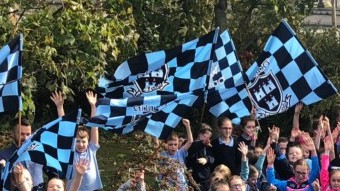 the chequered supporters flags also being waved in the source photograph.