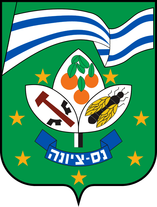Sources: e-mail from Ms. Rachel Zait, 27 August 2001; desk flag; municipal website. The municipal emblem was published in the official gazette (Rashumot), YP 633, 13 November 1958 (as the emblem for the then Local Council Nes Ziyyona).