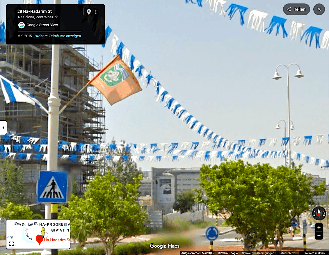 Nes Ziyyona municipal website shows a photo of an Israeli flag with the inscription Nes-Ziyyona (meaning Flag to Zion). It is not the municipal flag but the reconstruction of a historical (?) flag. According to historical sources, on the day of the Brith of the first newborn of the settlement on 1 January 1891, suddenly a local youngster, Michael Halperin (a known legendary figure later on) arrived, riding his horse and waving a blue-white flag with the inscription NES ZIYYONA. A very brave gesture in an era when no flag was permitted to be hoisted by the Ottoman authorities. This brought the settlers to change the name from its former names (Rose Valley, Reuven Estate and Tel-Aviv Estate) to Nes Ziyyona. As a matter of fact, no source that I am familiar with describes what the flag looked like and it seems it was not like the Zionist (later Israel) flag, probably designed years after. Thus its description as the current flag with the inscription, as it appears in the website is some kind of urban legend. Nevertheless, Nes Ziyyona claims the right as the first place where the Zionist flag appeared in public.