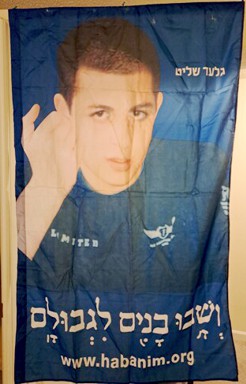 Gilad Shalit (גלעד שליט, born 28 August 1986) is a former POW (prisoner of war) soldier of the Israel Defense Forces (IDF) who on 25 June 2006, was captured by Palestinian militants in a cross-border raid via a tunnel beneath the Gaza-Israeli border. Hamas held him captive for over five years, until his release on 18 October 2011 as part of a prisoner-exchange deal [As part of this deal Israel released 1027 terrorists from prison. One of them was Yahya Sinwar]. This flag/banner was displayed to remind Israelis not to forget the long-imprisoned soldier. Apparently, something promoted by the "habanim.org" c. 2010 (habanim = the boys/sons).