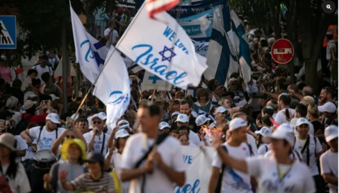Israel-supporting flags "We love Israel", together with Finnish national flags on a march of Evangelical Christians in Jerusalem (2019). (source: haaretz.com [with paywall], picture)