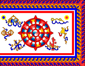 The Kingdom Of Sikkim [as it was then] had a flag that flown there from 1962 till 1967; it was in existence for around 5 years. [It was] an ornamental flag of an unusual design. It comprise[d] of a white field, the chief, base, and fly sides of which had the 'triple border' of red (outer)/white/blue (inner). A big red Khorlo prayer wheel is centered thereon, while the remaining panel area was charged with a variety of various religious motifs in shades of red, gold, green, and blue. The thick red portion of the 'triple border' had smaller charges (what looked like crescents and 'ticks') in yellow, green, and blue.contributed by Robert Wheelock, 18 January 2001