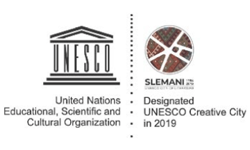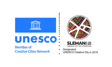 The flag started to be used sometime in the year 2023 (or very last months of 2022). It depicts a blue-and-white version of the UNESCO logo, reading underneath "unesco" and "Member of Creative Cities Network". To the right, the Slemani governorate logo is depicted with the text Designated UNESCO Creative City in 2019 underneath.