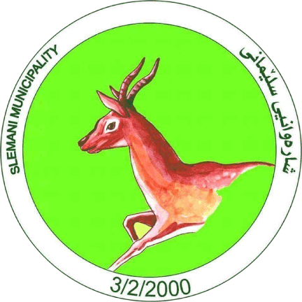 The logo depicts a white outer ring outlined entirely in green. There is text to the upper-left that reads "SLEMANI MUNICIPALITY" and text to the upper-right reading the same in Arabic. At the bottom is "3/2/2000", probably indicating the date of municipalization as 3 February 2000. In the center is a bright green field, depicting over it a deer indicating its fauna.