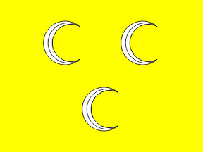 Rectangular ~4:7 flag with five unequal symmetrical horizontal stripes of blue, yellow, and green (approx. 3+2+3+2+3), with deep triangular cut-out but with green, central stripe protruding to the middle of the cut-out as a lobed langue; on the green stripe, a yellow scimitar pointing to the flag and on the fly a six-petal florette between two crescents, pointing inwards, all yellow; on each of the yellow stripes two yellow couped stubby ("Swiss") crosses; and on each of the blue stripes three florettes alternating with two crescents pointing flywards, all yellow (I kept the black "holding lines"ť from the original since there would be no way to present the yellow crosses on yellow).