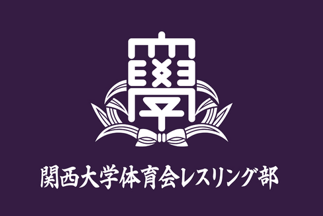 Wrestling club; The club flag has purplish blue background with a white university emblem and horizontally written kanji university and club name in white.