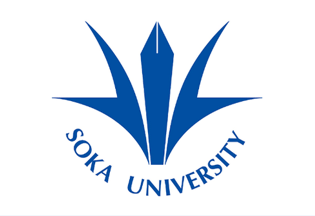 Located in Hachioji City Tokyo and established in 1971. The university flag has white background with a blue emblem and blue English university name written horizontally. The emblem of the university is designed with a pen in the center and phoenix wings on both sides. The pen represents wisdom, and the phoenix's wings signify the university's majestic flight to the world.