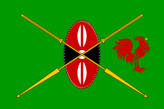 "The Standard of the President is dark green, with a small version of the shield crossed by two large assegais [sic] in the centre, and near the fly edge a golden cockerel. The latter is the emblem of KANU."Source: [c2b81], page 151.