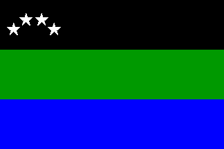 Proportions 2:3. Horizontal black-green-blue. Four white 5-pointed stars